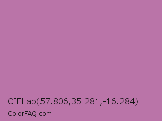 CIELab 57.806,35.281,-16.284 Color is a normal magenta color and the nearest color is Pearly Purple #b768a2. Hex code #ba74a8 and RGB value is rgb(186,116,168). In RGB color space, this color is composed of 73% red, 45% green, 66% blue, In CMYK color space, this color is composed of 0% cyan, 38% magenta, 10% yellow , 27% black , In HSL color space, this color has a hue angle of 315° , 34% saturation and 59% lightness.