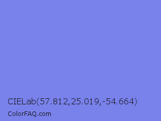 CIELab 57.812,25.019,-54.664 Color is a light blue color and the nearest color is Chetwode Blue #8581d9. Hex code #7981eb and RGB value is rgb(121,129,235). In RGB color space, this color is composed of 47% red, 51% green, 92% blue, In CMYK color space, this color is composed of 49% cyan, 45% magenta, 0% yellow , 8% black , In HSL color space, this color has a hue angle of 236° , 74% saturation and 70% lightness.