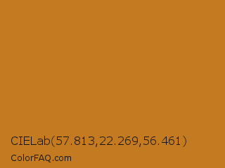 CIELab 57.813,22.269,56.461 Color is a normal orange color and the nearest color is Ochre #cc7722. Hex code #c47a21 and RGB value is rgb(196,122,33). In RGB color space, this color is composed of 77% red, 48% green, 13% blue, In CMYK color space, this color is composed of 0% cyan, 38% magenta, 83% yellow , 23% black , In HSL color space, this color has a hue angle of 33° , 71% saturation and 45% lightness.
