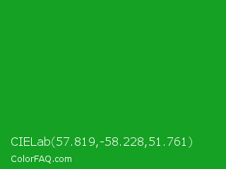 CIELab 57.819,-58.228,51.761 Color is a normal green color and the nearest color is Forest Green #228b22. Hex code #15a123 and RGB value is rgb(21,161,35). In RGB color space, this color is composed of 8% red, 63% green, 14% blue, In CMYK color space, this color is composed of 87% cyan, 0% magenta, 78% yellow , 37% black , In HSL color space, this color has a hue angle of 126° , 77% saturation and 36% lightness.