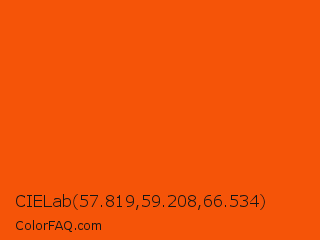 CIELab 57.819,59.208,66.534 Color is a normal orange color and the nearest color is Tangelo #f94d00. Hex code #f55408 and RGB value is rgb(245,84,8). In RGB color space, this color is composed of 96% red, 33% green, 3% blue, In CMYK color space, this color is composed of 0% cyan, 66% magenta, 97% yellow , 4% black , In HSL color space, this color has a hue angle of 19° , 94% saturation and 50% lightness.