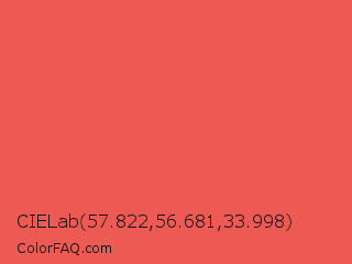 CIELab 57.822,56.681,33.998 Color is a light red color and the nearest color is Sunset Orange #fd5e53. Hex code #ed5953 and RGB value is rgb(237,89,83). In RGB color space, this color is composed of 93% red, 35% green, 33% blue, In CMYK color space, this color is composed of 0% cyan, 62% magenta, 65% yellow , 7% black , In HSL color space, this color has a hue angle of 2° , 81% saturation and 63% lightness.