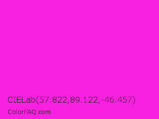 CIELab 57.822,89.122,-46.457 Color is a normal magenta color and the nearest color is Hot Magenta #ff1dce. Hex code #f521de and RGB value is rgb(245,33,222). In RGB color space, this color is composed of 96% red, 13% green, 87% blue, In CMYK color space, this color is composed of 0% cyan, 87% magenta, 9% yellow , 4% black , In HSL color space, this color has a hue angle of 307° , 91% saturation and 55% lightness.