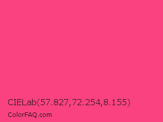 CIELab 57.827,72.254,8.155 Color is a light rose color and the nearest color is Sasquatch Socks #ff4681. Hex code #fa4280 and RGB value is rgb(250,66,128). In RGB color space, this color is composed of 98% red, 26% green, 50% blue, In CMYK color space, this color is composed of 0% cyan, 74% magenta, 49% yellow , 2% black , In HSL color space, this color has a hue angle of 340° , 95% saturation and 62% lightness.