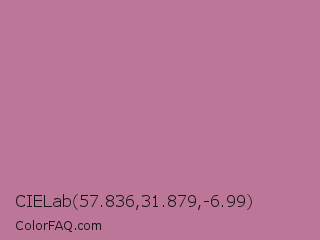 CIELab 57.836,31.879,-6.99 Color is a normal rose color and the nearest color is English Lavender #b48395. Hex code #bb7698 and RGB value is rgb(187,118,152). In RGB color space, this color is composed of 73% red, 46% green, 60% blue, In CMYK color space, this color is composed of 0% cyan, 37% magenta, 19% yellow , 27% black , In HSL color space, this color has a hue angle of 330° , 34% saturation and 60% lightness.