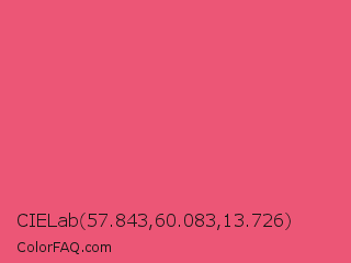 CIELab 57.843,60.083,13.726 Color is a light red color and the nearest color is Dark Pink #e75480. Hex code #ec5676 and RGB value is rgb(236,86,118). In RGB color space, this color is composed of 93% red, 34% green, 46% blue, In CMYK color space, this color is composed of 0% cyan, 64% magenta, 50% yellow , 7% black , In HSL color space, this color has a hue angle of 347° , 80% saturation and 63% lightness.