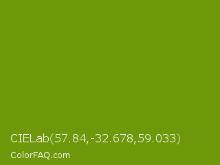 CIELab 57.84,-32.678,59.033 Color is a normal lime color and the nearest color is Limeade #6f9d02. Hex code #6e980a and RGB value is rgb(110,152,10). In RGB color space, this color is composed of 43% red, 60% green, 4% blue, In CMYK color space, this color is composed of 28% cyan, 0% magenta, 93% yellow , 40% black , In HSL color space, this color has a hue angle of 78° , 88% saturation and 32% lightness.
