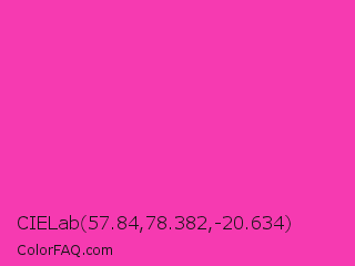 CIELab 57.84,78.382,-20.634 Color is a normal magenta color and the nearest color is Frostbite #e936a7. Hex code #f63ab1 and RGB value is rgb(246,58,177). In RGB color space, this color is composed of 96% red, 23% green, 69% blue, In CMYK color space, this color is composed of 0% cyan, 76% magenta, 28% yellow , 4% black , In HSL color space, this color has a hue angle of 322° , 91% saturation and 60% lightness.