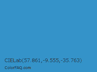 CIELab 57.861,-9.555,-35.763 Color is a normal blue color and the nearest color is Curious Blue #2596d1. Hex code #3493c9 and RGB value is rgb(52,147,201). In RGB color space, this color is composed of 20% red, 58% green, 79% blue, In CMYK color space, this color is composed of 74% cyan, 27% magenta, 0% yellow , 21% black , In HSL color space, this color has a hue angle of 202° , 59% saturation and 50% lightness.