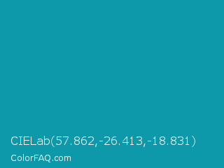 CIELab 57.862,-26.413,-18.831 Color is a normal cyan color and the nearest color is Blue Green #0d98ba. Hex code #0e99ab and RGB value is rgb(14,153,171). In RGB color space, this color is composed of 5% red, 60% green, 67% blue, In CMYK color space, this color is composed of 92% cyan, 11% magenta, 0% yellow , 33% black , In HSL color space, this color has a hue angle of 187° , 85% saturation and 36% lightness.