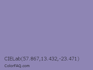 CIELab 57.867,13.432,-23.471 Color is a light indigo color and the nearest color is Lavender Purple #967bb6. Hex code #8e85b4 and RGB value is rgb(142,133,180). In RGB color space, this color is composed of 56% red, 52% green, 71% blue, In CMYK color space, this color is composed of 21% cyan, 26% magenta, 0% yellow , 29% black , In HSL color space, this color has a hue angle of 251° , 24% saturation and 61% lightness.