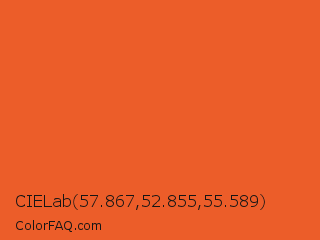 CIELab 57.867,52.855,55.589 Color is a normal orange color and the nearest color is Vivid Vermilion #e56024. Hex code #ec5d29 and RGB value is rgb(236,93,41). In RGB color space, this color is composed of 93% red, 36% green, 16% blue, In CMYK color space, this color is composed of 0% cyan, 61% magenta, 83% yellow , 7% black , In HSL color space, this color has a hue angle of 16° , 84% saturation and 54% lightness.