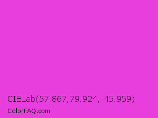 CIELab 57.867,79.924,-45.959 Color is a normal magenta color and the nearest color is Purple Pizzazz #fe4eda. Hex code #e83edd and RGB value is rgb(232,62,221). In RGB color space, this color is composed of 91% red, 24% green, 87% blue, In CMYK color space, this color is composed of 0% cyan, 73% magenta, 5% yellow , 9% black , In HSL color space, this color has a hue angle of 304° , 79% saturation and 58% lightness.
