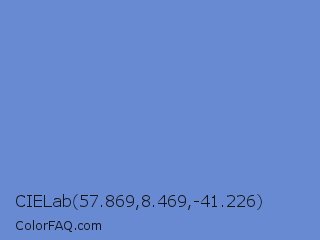 CIELab 57.869,8.469,-41.226 Color is a light blue color and the nearest color is Danube #6093d1. Hex code #688ad3 and RGB value is rgb(104,138,211). In RGB color space, this color is composed of 41% red, 54% green, 83% blue, In CMYK color space, this color is composed of 51% cyan, 35% magenta, 0% yellow , 17% black , In HSL color space, this color has a hue angle of 221° , 55% saturation and 62% lightness.
