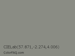 CIELab 57.871,-2.274,4.006 Color is a normal lime color and the nearest color is Stack #8a8f8a. Hex code #8a8c84 and RGB value is rgb(138,140,132). In RGB color space, this color is composed of 54% red, 55% green, 52% blue, In CMYK color space, this color is composed of 1% cyan, 0% magenta, 6% yellow , 45% black , In HSL color space, this color has a hue angle of 75° , 3% saturation and 53% lightness.