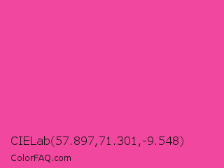 CIELab 57.897,71.301,-9.548 Color is a light rose color and the nearest color is Rose Bonbon #f9429e. Hex code #f2479e and RGB value is rgb(242,71,158). In RGB color space, this color is composed of 95% red, 28% green, 62% blue, In CMYK color space, this color is composed of 0% cyan, 71% magenta, 35% yellow , 5% black , In HSL color space, this color has a hue angle of 329° , 87% saturation and 61% lightness.