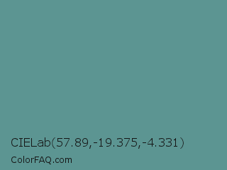 CIELab 57.89,-19.375,-4.331 Color is a normal cyan color and the nearest color is Patina #639a8f. Hex code #5c9592 and RGB value is rgb(92,149,146). In RGB color space, this color is composed of 36% red, 58% green, 57% blue, In CMYK color space, this color is composed of 38% cyan, 0% magenta, 2% yellow , 42% black , In HSL color space, this color has a hue angle of 177° , 24% saturation and 47% lightness.