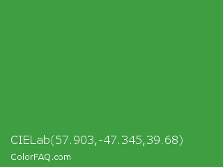 CIELab 57.903,-47.345,39.68 Color is a normal green color and the nearest color is May Green #4c9141. Hex code #3e9e41 and RGB value is rgb(62,158,65). In RGB color space, this color is composed of 24% red, 62% green, 25% blue, In CMYK color space, this color is composed of 61% cyan, 0% magenta, 59% yellow , 38% black , In HSL color space, this color has a hue angle of 122° , 44% saturation and 43% lightness.