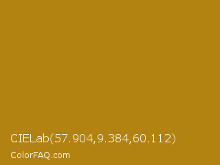CIELab 57.904,9.384,60.112 Color is a normal orange color and the nearest color is Dark Goldenrod #b8860b. Hex code #b38312 and RGB value is rgb(179,131,18). In RGB color space, this color is composed of 70% red, 51% green, 7% blue, In CMYK color space, this color is composed of 0% cyan, 27% magenta, 90% yellow , 30% black , In HSL color space, this color has a hue angle of 42° , 82% saturation and 39% lightness.