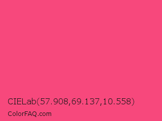 CIELab 57.908,69.137,10.558 Color is a light rose color and the nearest color is Sasquatch Socks #ff4681. Hex code #f7487c and RGB value is rgb(247,72,124). In RGB color space, this color is composed of 97% red, 28% green, 49% blue, In CMYK color space, this color is composed of 0% cyan, 71% magenta, 50% yellow , 3% black , In HSL color space, this color has a hue angle of 342° , 92% saturation and 63% lightness.