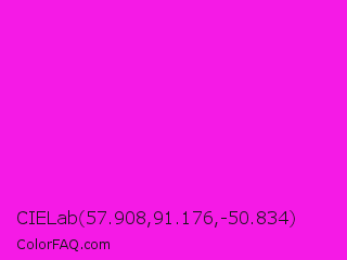 CIELab 57.908,91.176,-50.834 Color is a normal magenta color and the nearest color is Hot Magenta #ff1dce. Hex code #f51ae6 and RGB value is rgb(245,26,230). In RGB color space, this color is composed of 96% red, 10% green, 90% blue, In CMYK color space, this color is composed of 0% cyan, 89% magenta, 6% yellow , 4% black , In HSL color space, this color has a hue angle of 304° , 92% saturation and 53% lightness.