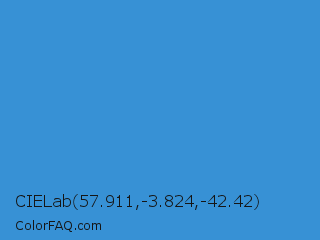 CIELab 57.911,-3.824,-42.42 Color is a normal blue color and the nearest color is Tufts Blue #3e8ede. Hex code #3791d5 and RGB value is rgb(55,145,213). In RGB color space, this color is composed of 22% red, 57% green, 84% blue, In CMYK color space, this color is composed of 74% cyan, 32% magenta, 0% yellow , 16% black , In HSL color space, this color has a hue angle of 206° , 65% saturation and 53% lightness.