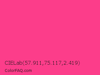 CIELab 57.911,75.117,2.419 Color is a light rose color and the nearest color is French Fuchsia #fd3f92. Hex code #fc3d8a and RGB value is rgb(252,61,138). In RGB color space, this color is composed of 99% red, 24% green, 54% blue, In CMYK color space, this color is composed of 0% cyan, 76% magenta, 45% yellow , 1% black , In HSL color space, this color has a hue angle of 336° , 97% saturation and 61% lightness.