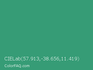 CIELab 57.913,-38.656,11.419 Color is a normal green color and the nearest color is Illuminating Emerald #319177. Hex code #369c76 and RGB value is rgb(54,156,118). In RGB color space, this color is composed of 21% red, 61% green, 46% blue, In CMYK color space, this color is composed of 65% cyan, 0% magenta, 24% yellow , 39% black , In HSL color space, this color has a hue angle of 158° , 49% saturation and 41% lightness.