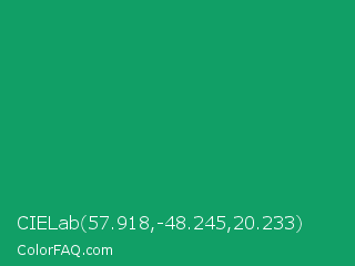 CIELab 57.918,-48.245,20.233 Color is a normal green color and the nearest color is Green Haze #01a368. Hex code #119f66 and RGB value is rgb(17,159,102). In RGB color space, this color is composed of 7% red, 62% green, 40% blue, In CMYK color space, this color is composed of 89% cyan, 0% magenta, 36% yellow , 38% black , In HSL color space, this color has a hue angle of 156° , 81% saturation and 35% lightness.