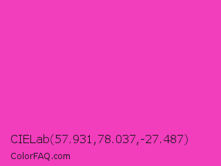 CIELab 57.931,78.037,-27.487 Color is a normal magenta color and the nearest color is Razzle Dazzle Rose #ff33cc. Hex code #f23dbd and RGB value is rgb(242,61,189). In RGB color space, this color is composed of 95% red, 24% green, 74% blue, In CMYK color space, this color is composed of 0% cyan, 75% magenta, 22% yellow , 5% black , In HSL color space, this color has a hue angle of 318° , 87% saturation and 59% lightness.