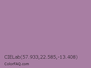 CIELab 57.933,22.585,-13.408 Color is a normal magenta color and the nearest color is Bouquet #ae809e. Hex code #a87ea3 and RGB value is rgb(168,126,163). In RGB color space, this color is composed of 66% red, 49% green, 64% blue, In CMYK color space, this color is composed of 0% cyan, 25% magenta, 3% yellow , 34% black , In HSL color space, this color has a hue angle of 307° , 19% saturation and 58% lightness.
