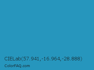 CIELab 57.941,-16.964,-28.888 Color is a normal blue color and the nearest color is Eastern Blue #1e9ab0. Hex code #2696bd and RGB value is rgb(38,150,189). In RGB color space, this color is composed of 15% red, 59% green, 74% blue, In CMYK color space, this color is composed of 80% cyan, 21% magenta, 0% yellow , 26% black , In HSL color space, this color has a hue angle of 195° , 67% saturation and 45% lightness.