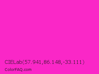 CIELab 57.941,86.148,-33.111 Color is a normal magenta color and the nearest color is Hot Magenta #ff1dce. Hex code #fa27c7 and RGB value is rgb(250,39,199). In RGB color space, this color is composed of 98% red, 15% green, 78% blue, In CMYK color space, this color is composed of 0% cyan, 84% magenta, 20% yellow , 2% black , In HSL color space, this color has a hue angle of 315° , 95% saturation and 57% lightness.