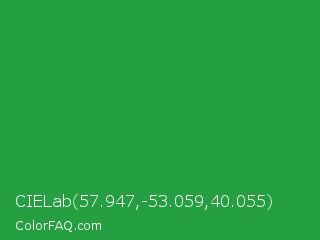 CIELab 57.947,-53.059,40.055 Color is a normal green color and the nearest color is Wageningen Green #34b233. Hex code #25a040 and RGB value is rgb(37,160,64). In RGB color space, this color is composed of 15% red, 63% green, 25% blue, In CMYK color space, this color is composed of 77% cyan, 0% magenta, 60% yellow , 37% black , In HSL color space, this color has a hue angle of 133° , 62% saturation and 39% lightness.