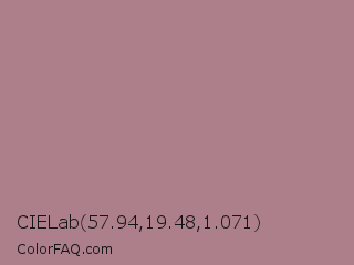CIELab 57.94,19.48,1.071 Color is a normal red color and the nearest color is English Lavender #b48395. Hex code #ad7f8a and RGB value is rgb(173,127,138). In RGB color space, this color is composed of 68% red, 50% green, 54% blue, In CMYK color space, this color is composed of 0% cyan, 27% magenta, 20% yellow , 32% black , In HSL color space, this color has a hue angle of 346° , 22% saturation and 59% lightness.