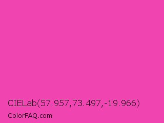 CIELab 57.957,73.497,-19.966 Color is a light magenta color and the nearest color is Brilliant Rose #f653a6. Hex code #f045b0 and RGB value is rgb(240,69,176). In RGB color space, this color is composed of 94% red, 27% green, 69% blue, In CMYK color space, this color is composed of 0% cyan, 71% magenta, 27% yellow , 6% black , In HSL color space, this color has a hue angle of 322° , 85% saturation and 61% lightness.