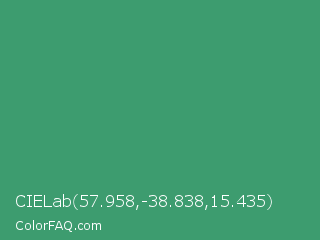 CIELab 57.958,-38.838,15.435 Color is a normal green color and the nearest color is Ocean Green #41aa78. Hex code #3d9c6f and RGB value is rgb(61,156,111). In RGB color space, this color is composed of 24% red, 61% green, 44% blue, In CMYK color space, this color is composed of 61% cyan, 0% magenta, 29% yellow , 39% black , In HSL color space, this color has a hue angle of 152° , 44% saturation and 43% lightness.