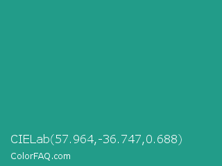 CIELab 57.964,-36.747,0.688 Color is a normal cyan color and the nearest color is Jungle Green #29ab87. Hex code #229c89 and RGB value is rgb(34,156,137). In RGB color space, this color is composed of 13% red, 61% green, 54% blue, In CMYK color space, this color is composed of 78% cyan, 0% magenta, 12% yellow , 39% black , In HSL color space, this color has a hue angle of 171° , 64% saturation and 37% lightness.