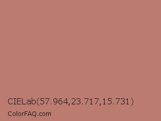 CIELab 57.964,23.717,15.731 Color is a normal red color and the nearest color is Contessa #c6726b. Hex code #bb7b71 and RGB value is rgb(187,123,113). In RGB color space, this color is composed of 73% red, 48% green, 44% blue, In CMYK color space, this color is composed of 0% cyan, 34% magenta, 40% yellow , 27% black , In HSL color space, this color has a hue angle of 8° , 35% saturation and 59% lightness.