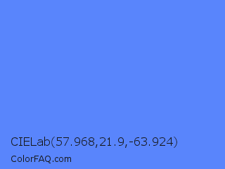 CIELab 57.968,21.9,-63.924 Color is a light blue color and the nearest color is Blueberry #4f86f7. Hex code #5985fc and RGB value is rgb(89,133,252). In RGB color space, this color is composed of 35% red, 52% green, 99% blue, In CMYK color space, this color is composed of 65% cyan, 47% magenta, 0% yellow , 1% black , In HSL color space, this color has a hue angle of 224° , 96% saturation and 67% lightness.
