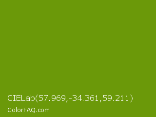 CIELab 57.969,-34.361,59.211 Color is a normal lime color and the nearest color is Limeade #6f9d02. Hex code #6b9909 and RGB value is rgb(107,153,9). In RGB color space, this color is composed of 42% red, 60% green, 4% blue, In CMYK color space, this color is composed of 30% cyan, 0% magenta, 94% yellow , 40% black , In HSL color space, this color has a hue angle of 79° , 89% saturation and 32% lightness.
