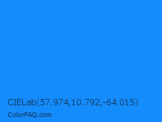 CIELab 57.974,10.792,-64.015 Color is a normal blue color and the nearest color is Dodger Blue #1e90ff. Hex code #148cfc and RGB value is rgb(20,140,252). In RGB color space, this color is composed of 8% red, 55% green, 99% blue, In CMYK color space, this color is composed of 92% cyan, 44% magenta, 0% yellow , 1% black , In HSL color space, this color has a hue angle of 209° , 97% saturation and 53% lightness.