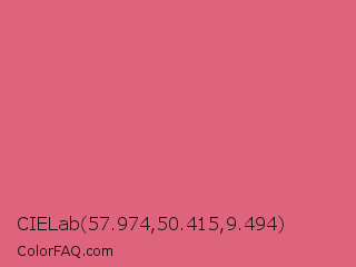 CIELab 57.974,50.415,9.494 Color is a light red color and the nearest color is Blush #de5d83. Hex code #de637d and RGB value is rgb(222,99,125). In RGB color space, this color is composed of 87% red, 39% green, 49% blue, In CMYK color space, this color is composed of 0% cyan, 55% magenta, 44% yellow , 13% black , In HSL color space, this color has a hue angle of 347° , 65% saturation and 63% lightness.