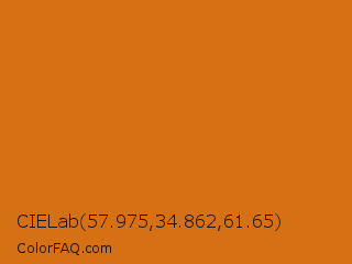 CIELab 57.975,34.862,61.65 Color is a normal orange color and the nearest color is Hot Cinnamon #d2691e. Hex code #d67014 and RGB value is rgb(214,112,20). In RGB color space, this color is composed of 84% red, 44% green, 8% blue, In CMYK color space, this color is composed of 0% cyan, 48% magenta, 91% yellow , 16% black , In HSL color space, this color has a hue angle of 28° , 83% saturation and 46% lightness.