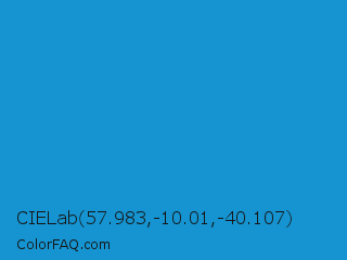 CIELab 57.983,-10.01,-40.107 Color is a normal blue color and the nearest color is Rich Electric Blue #0892d0. Hex code #1594d1 and RGB value is rgb(21,148,209). In RGB color space, this color is composed of 8% red, 58% green, 82% blue, In CMYK color space, this color is composed of 90% cyan, 29% magenta, 0% yellow , 18% black , In HSL color space, this color has a hue angle of 199° , 82% saturation and 45% lightness.
