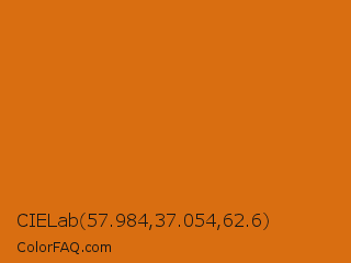 CIELab 57.984,37.054,62.6 Color is a normal orange color and the nearest color is Hot Cinnamon #d2691e. Hex code #d96e11 and RGB value is rgb(217,110,17). In RGB color space, this color is composed of 85% red, 43% green, 7% blue, In CMYK color space, this color is composed of 0% cyan, 49% magenta, 92% yellow , 15% black , In HSL color space, this color has a hue angle of 28° , 85% saturation and 46% lightness.