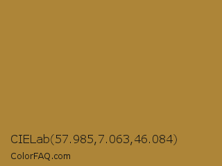 CIELab 57.985,7.063,46.084 Color is a normal orange color and the nearest color is Luxor Gold #a7882c. Hex code #ad8538 and RGB value is rgb(173,133,56). In RGB color space, this color is composed of 68% red, 52% green, 22% blue, In CMYK color space, this color is composed of 0% cyan, 23% magenta, 68% yellow , 32% black , In HSL color space, this color has a hue angle of 39° , 51% saturation and 45% lightness.