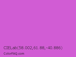 CIELab 58.002,61.88,-40.886 Color is a normal magenta color and the nearest color is Orchid #da70d6. Hex code #d15cd4 and RGB value is rgb(209,92,212). In RGB color space, this color is composed of 82% red, 36% green, 83% blue, In CMYK color space, this color is composed of 1% cyan, 57% magenta, 0% yellow , 17% black , In HSL color space, this color has a hue angle of 299° , 58% saturation and 60% lightness.
