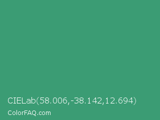 CIELab 58.006,-38.142,12.694 Color is a normal green color and the nearest color is Illuminating Emerald #319177. Hex code #3b9c74 and RGB value is rgb(59,156,116). In RGB color space, this color is composed of 23% red, 61% green, 45% blue, In CMYK color space, this color is composed of 62% cyan, 0% magenta, 26% yellow , 39% black , In HSL color space, this color has a hue angle of 155° , 45% saturation and 42% lightness.