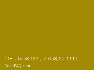 CIELab 58.009,-2.058,62.111 Color is a normal yellow color and the nearest color is Dark Yellow #9b870c. Hex code #a38a03 and RGB value is rgb(163,138,3). In RGB color space, this color is composed of 64% red, 54% green, 1% blue, In CMYK color space, this color is composed of 0% cyan, 15% magenta, 98% yellow , 36% black , In HSL color space, this color has a hue angle of 51° , 96% saturation and 33% lightness.